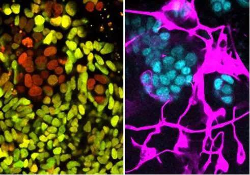 5、干细胞教你如何永生不变 来自欧洲分子生物学实验所的研究者近日指出,名为microRNA-142的分子可以使得干细胞保持不变,而不是生长分化成为多种特殊类型的细胞;在合适的情况下,含有低水平microRNA-142分子的干细胞(左图绿色的细胞)就会生长成为神经元(右图红色的细胞),但携带高水平microRNA-142分子的干细胞并不会改变(右图蓝色细胞)。