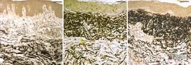 图中深染的是胶原纤维组织。可见,后两种方法可以显著增加皮肤中的胶原前卫组织含量,从而达到实现面部年轻化的目的。
