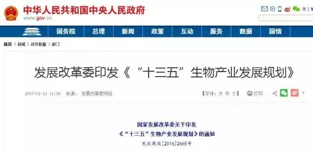 2017.01.12:国家发展改革委正式印发《“十三五”生物产业发展规划》