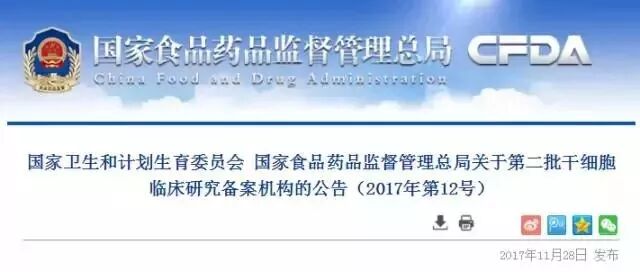 2017.11.28:72家!第二批干细胞临床研究备案机构名单公布