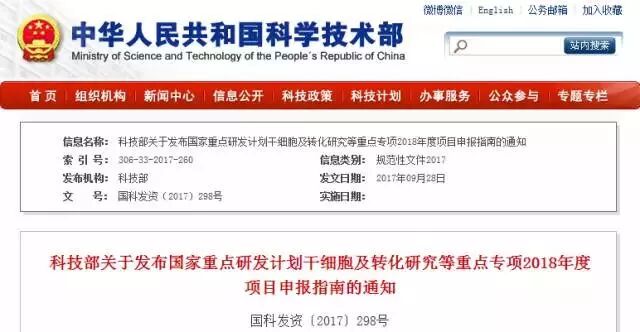 2017.09.28:干细胞及转化研究试点专项2018年度申报指南发布