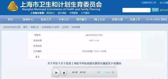 2017.01.24::上海卫计委发布《关于促进上海医学科技创新发展的实施意见》