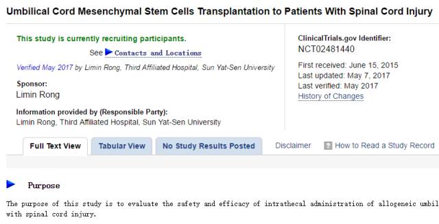 这项前瞻性临床试验已在ClinicalTrials网站上注册,编号为NCT02481440,目前仍处在招募状态,主要面向18至65岁的脊髓损伤患者,主要干预手段是同种异体脐带间充质干细胞蛛网膜下腔注射,主要评价指标为美国脊髓损伤协会制定的脊髓损伤神经功能评分标准。这项临床试验主要是为了探索UC-MSCs移植治疗脊髓损伤的安全性和有效性。 或许在不久的将来,干细胞疗法真的会开启人类治疗脊髓损伤的新时代!
