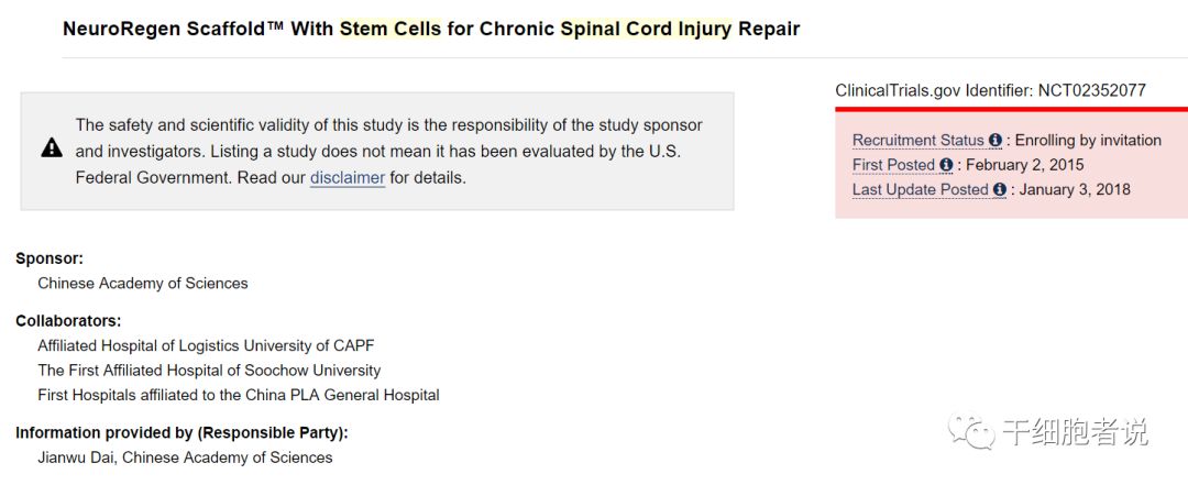 让我们把视线回到中国,中科院遗传与发育生物学研究所的戴建武团队从事脊髓损伤的再生修复研究多年。2015年1月,戴建武团队在国际上首次开展了神经再生胶原支架移植治疗陈旧性完全性脊髓损伤的临床研究。术中首次清理了瘢痕组织并移植了神经再生胶原支架,首批5例患者经过1年的安全性评估未发现与瘢痕清理和神经再生胶原支架移植相关的不良反应。他们开展的首批4例急性完全性脊髓损伤患者术后均出现运动功能改善。 其主要合作医院为解放军总医院第一附属医院(304医院)、武警后勤学院附属脑科医院、苏州大学附属第一医院等。