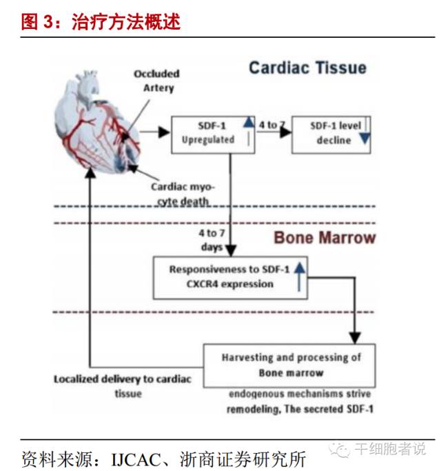 1.2 试验方法和原理 急性心肌梗死(acute myocardial infarction,AMI)发生后,伴随着心肌细胞的死亡。AMI即使早期成功血管重建也只能挽救缺血和顿抑的心肌,但是一旦发生坏死,心肌被纤维结缔组织替代,进而发生心室重构,有超过30%的患者发展为慢性缺血性心力衰竭。如何解决心肌细胞丢失是心血管疾病治疗中的关键问题。 干细胞治疗心肌梗死的核心问题在于:诱导干细胞定居于受损的心肌部位,分化为心肌代替坏死组织或者是提高原有存活心肌细胞的功能。其中最大的瓶颈为:足够数量和质量的干细胞定位于梗死区域。 干细胞对于心肌梗死的治疗时间是很重要的因素。心肌梗死发生的几分钟内,心肌组织缺氧导致心肌细胞凋亡和一些重要细胞因子的上调,特别是基质细胞衍生因子-1(SDF-1),它可以促使一部分干细胞归巢到梗死部位进行再修复。心肌梗死后SDF-1的局部浓度由于炎症因子的相互作用,在4天左右到达顶峰,然后逐渐下降。