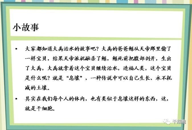 最后,它是一类在细胞发育过程中处于较原始阶段的、尚未充分分化的、尚不成熟的细胞。就像菩提祖师给孙悟空起名字的时候说的那样:“狲字去了兽傍,乃是个子系。子者,儿男也;系者,婴细也。正合婴儿之本论。教你姓‘孙’罢。”越小越年轻越是有变化的能力。 总结一下,干细胞就是体内能“分”会“变”的“婴儿”细胞。